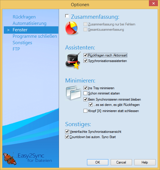 Knopf [X]: minimieren statt schliessen: Ändert die Funktion des X-Buttons im Hauptfenster auf "Minimieren". Nützlich um Easy2Sync nicht aus Versehen zu beenden.