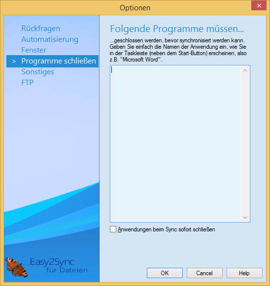 Daher können Sie Easy2Sync anweisen Sie zu warnen, wenn bestimmte Anwendungen noch laufen und der Synchronisationsprozess beginnt. Dazu geben Sie einfach den Namen der Anwendung ein, wie er in der Taskleiste erscheint (neben dem Start-Knopf). Falls dort nicht nur der Name der Anwendung steht, sondern auch der Dateiname, reicht es, den Namen der Anwendung einzugeben, z.B. ”Microsoft Word”.