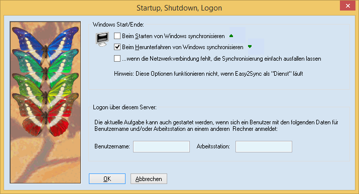 Aufgaben können gestartet werden, wenn Sie den Computer an- oder ausschalten (dies gilt nicht, wenn Easy2Sync als Dienst läuft). Dies können Sie hier einstellen. Wenn Aufgaben beim anschalten des Computers synchronisiert werden sollen, muss Easy2Sync beim booten gestartet werden. Dies können Sie in den Optionen einstellen. Wenn Sie statt einer einzelnen Aufgabe, lieber alle Aufgaben beim an- oder ausschalten synchronisieren möchten, können Sie auch das in den Optionen einstellen.
