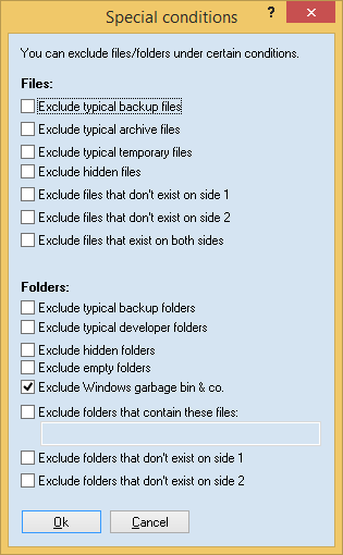 | • | Exclude folders depending of their content. This way you can exclude for example all folders that contain either the 3 files f1, f2 and f3 or the files g1 and g2. For this you'd have to enter: f1,f2,f3/g1,g2 |