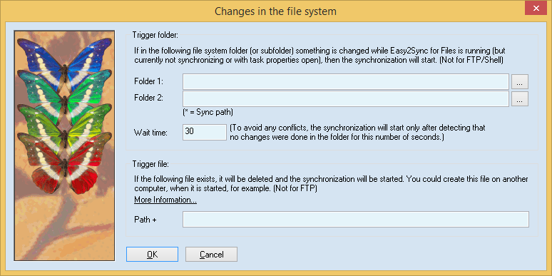 A trigger folder is simply a Windows folder that Easy2Sync watches for changes. if any file is changed by any application, a sync can be started. The folders that are being watches (up to 2) can be identical with the synchronized folders, but don't need to be. If you want to watch the synchronized folders, you can simply enter an asterisk ("*") as path.