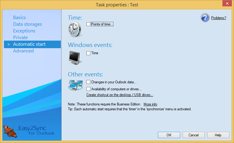 Easy2Sync for Outlook can not only start a synchronization manually, but also automatically, e.g. at certain times. You’ll find the right things for this in the task properties on the page "Automatic Start".