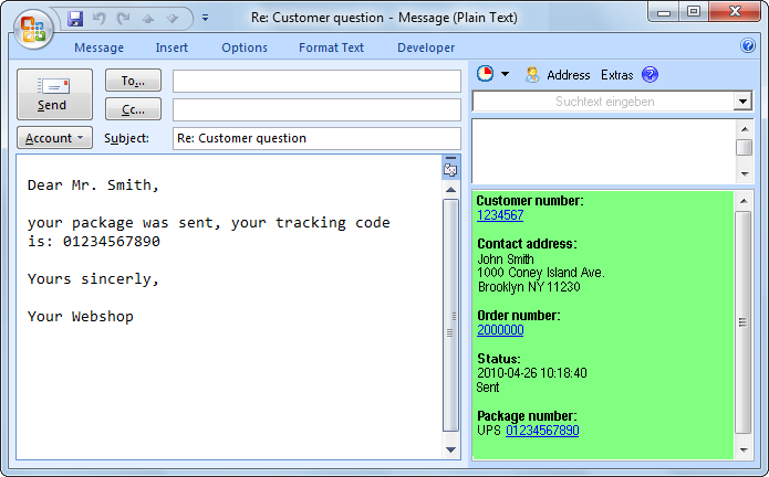 If no data was found for the e-mail address, ReplyButler checks if the e-mail contains an Amazon order number. If such a number is found, ReplyButler displays the data from this order and this customer in the sidebar.